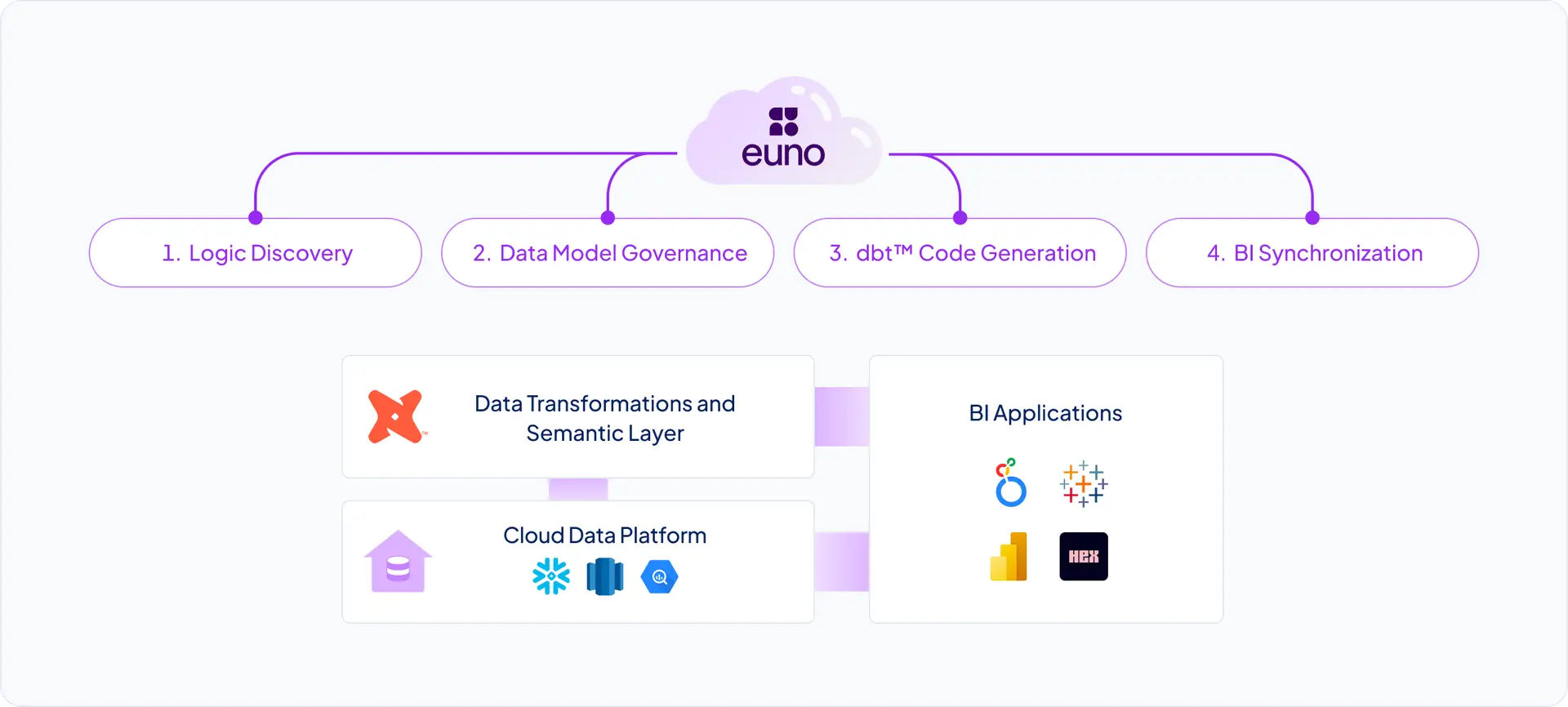 Euno enables data users to dynamically query dbt-metrics within their chosen BI tools, automatically translating semantic definitions into SQL for consistent calculations. On top of that, data teams can use Euno to promote measures and metrics defined in BI tools by automatically codifying them in dbt™/MetricFlow, adding them to the centrally governed semantic layer.