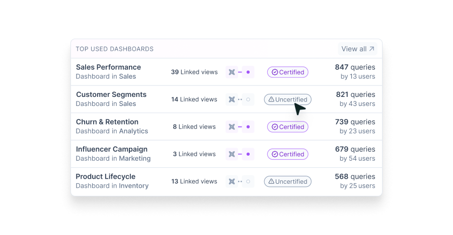 This is especially true for federated analytics environments. If you’ve got 100 analysts managing 20,000 dashboards, good luck figuring out which ones actually matter. Without usage insights, you end up with a mess: stale, duplicate, and irrelevant assets everywhere.