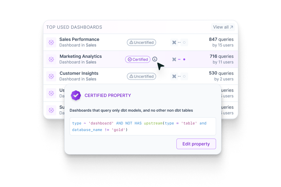 Each of these conditions is already tracked in the catalog. By aggregating them into a custom property, you make governance scalable, enforceable, and easy to act on. A great metadata catalog should let you configure custom properties, ensuring teams can set rules, track compliance, and take action, without relying on manual checks.