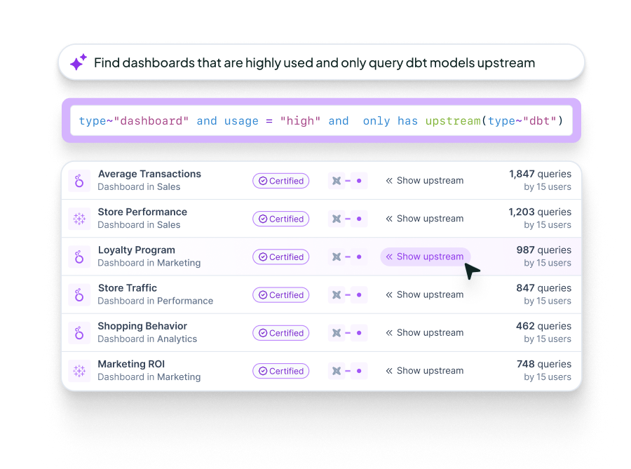 With a single query, you surface models that don’t meet governance standards and the responsible owners, without manually piecing information together. A modern metadata catalog should meet data teams where they are, whether through a familiar query language or AI-powered search. It will ensure metadata is not just stored but easily accessible and actionable.
