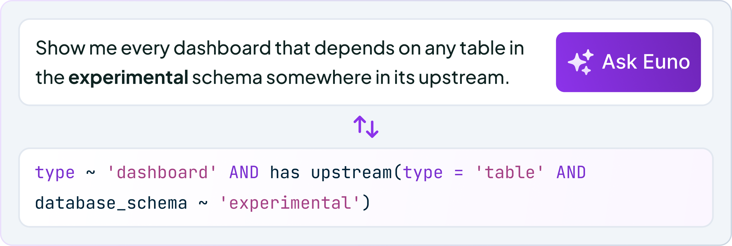One of the most powerful aspects of Euno for Bolt is its data model querying capability. It allows analytics engineers to explore relationships across layers and ask complex, multi-level questions about how data flows from the data sources all the way to Looker charts, including transformation logic, ownership, usage, and dependencies.