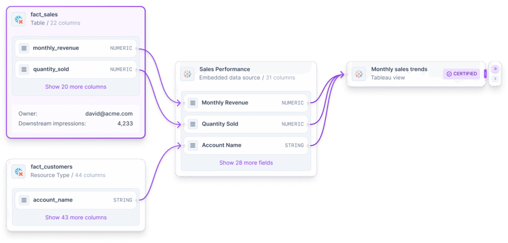 When metrics don’t match or data looks wrong, column lineage lets you trace the issue back to the specific transformation step, join condition, or calculation that’s causing the problem.
