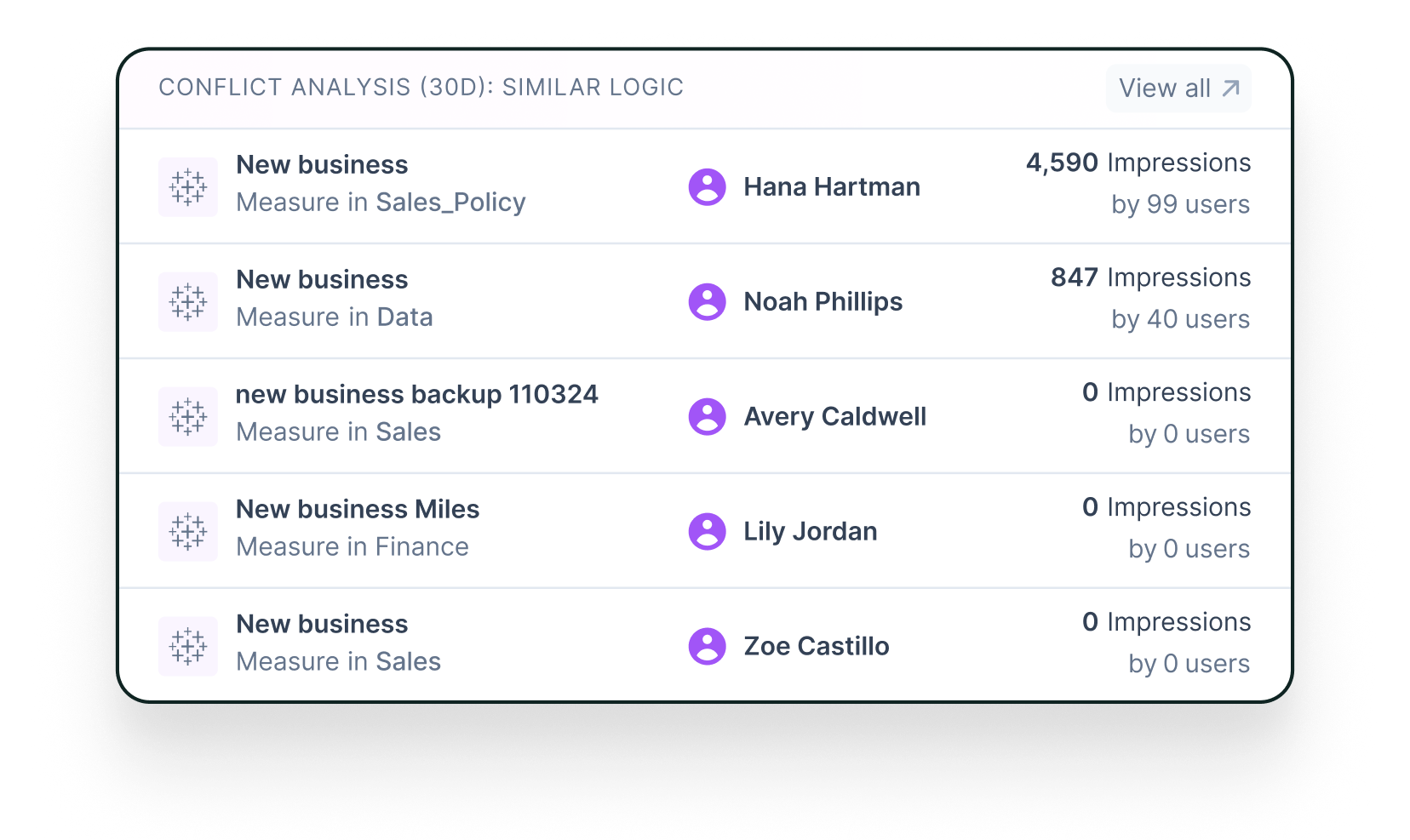 Eliminate duplicate or inconsistent metrics before they spread. Euno detects where similar definitions are used and maps their owners — ensuring everyone works from the same source of truth.