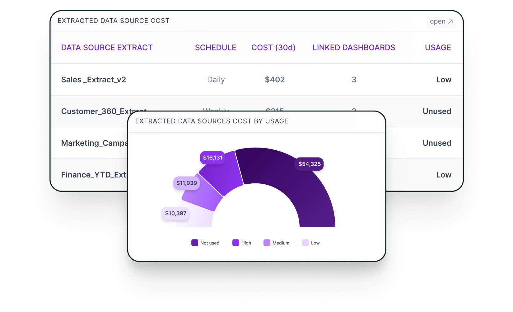 Over time, most of the organization’s dashboards become unused. Euno attributes dashboard usage to upstream dimensions, measures and refresh jobs, so you can see which assets deliver value, and which are just burning resources without being used.
