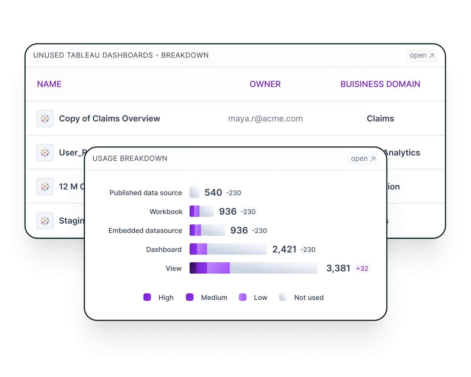 Euno flags assets with no recent activity, from warehouse tables that are never queried to BI dashboards with zero impressions, so you can keep your environment lean and easy to navigate.