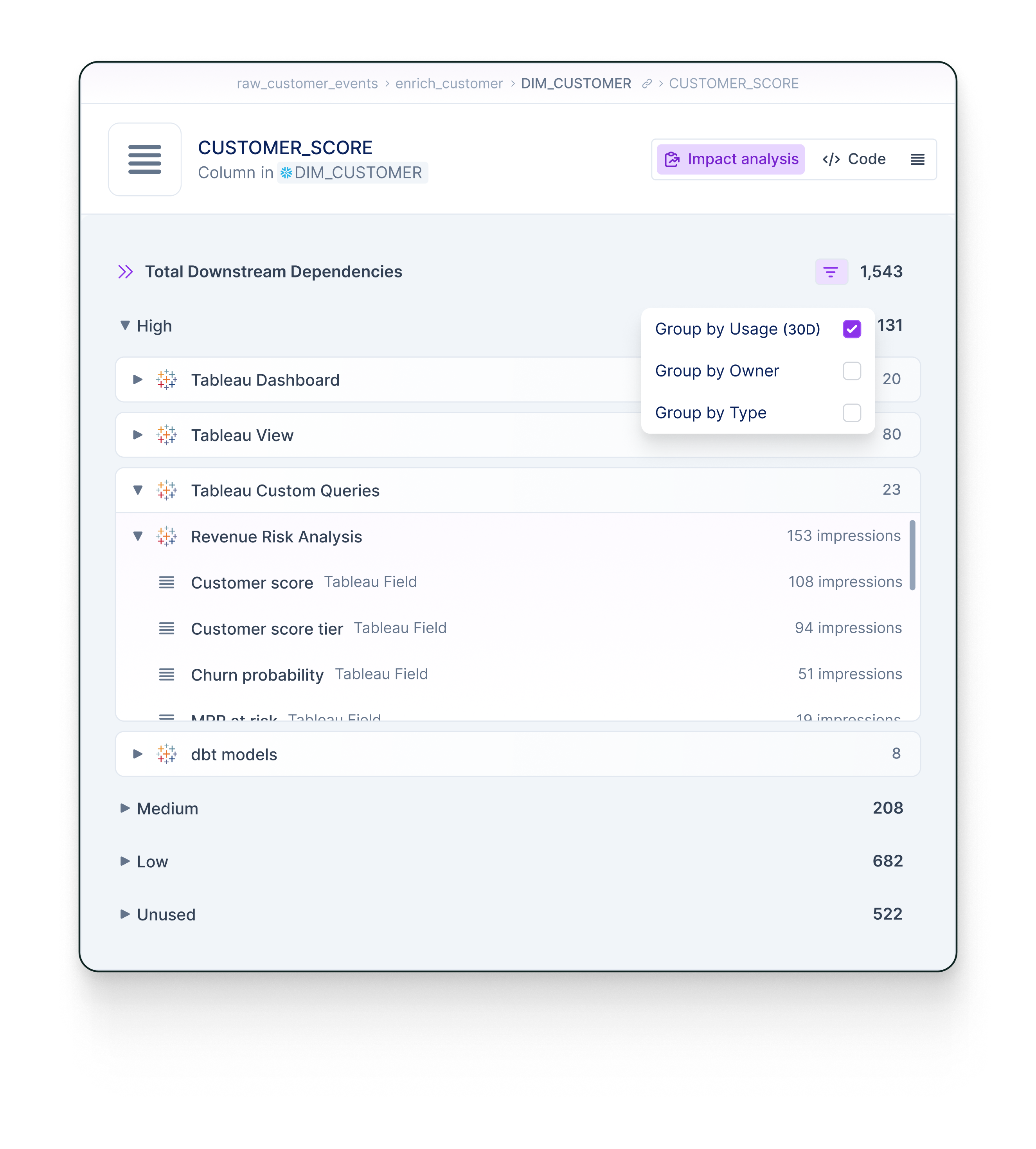 Instantly see what might break when you make changes. Euno maps downstream dependencies down to the column-level, prioritizes them by usage, and surfaces the right people to notify.