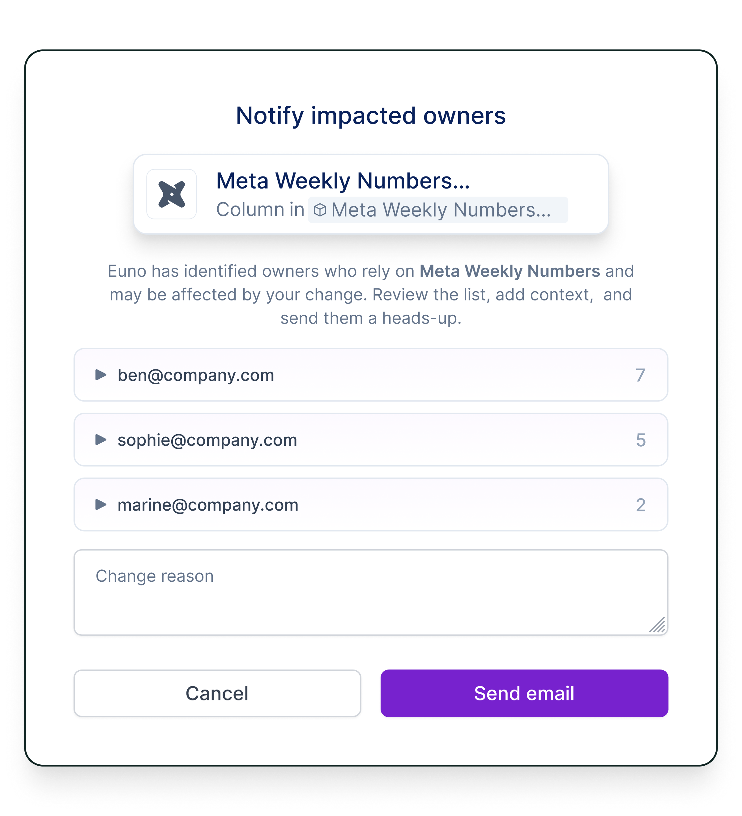 No more angry  Slack messages about broken dashboards. Euno automatically notifies every impacted asset owner, giving them the context they need to act fast.