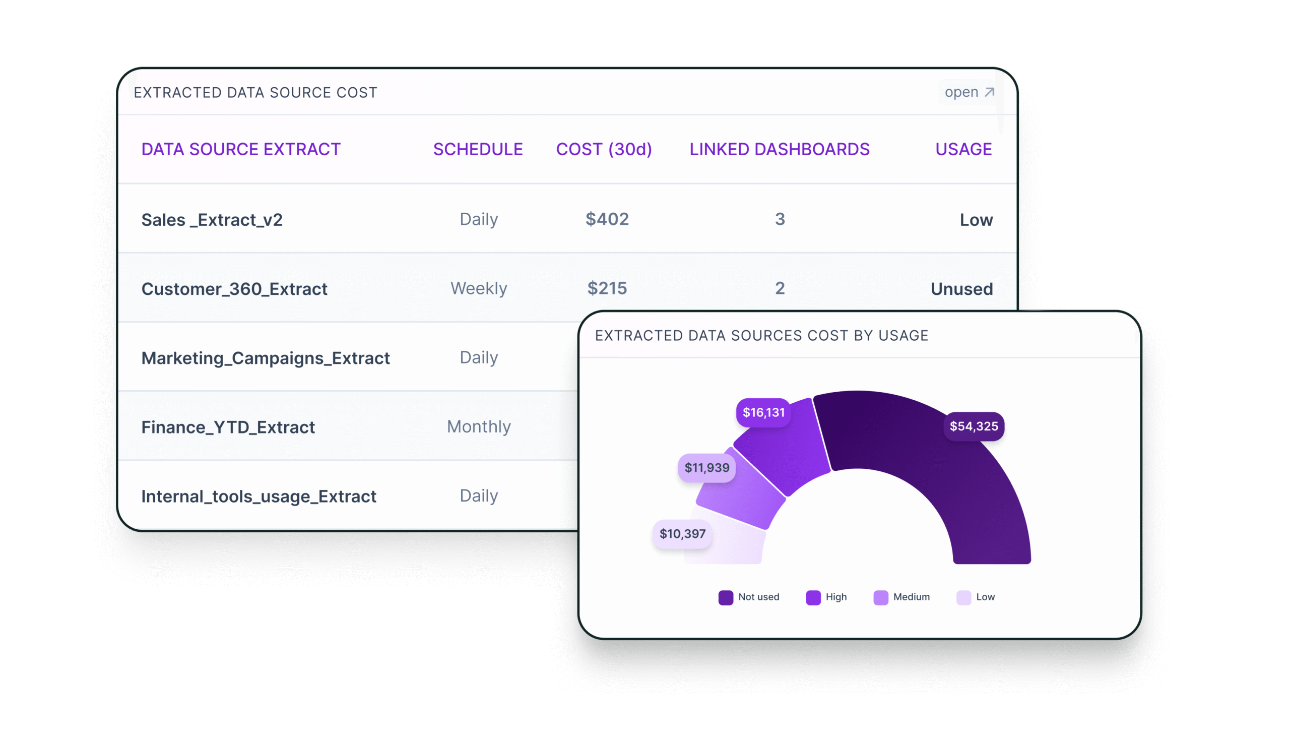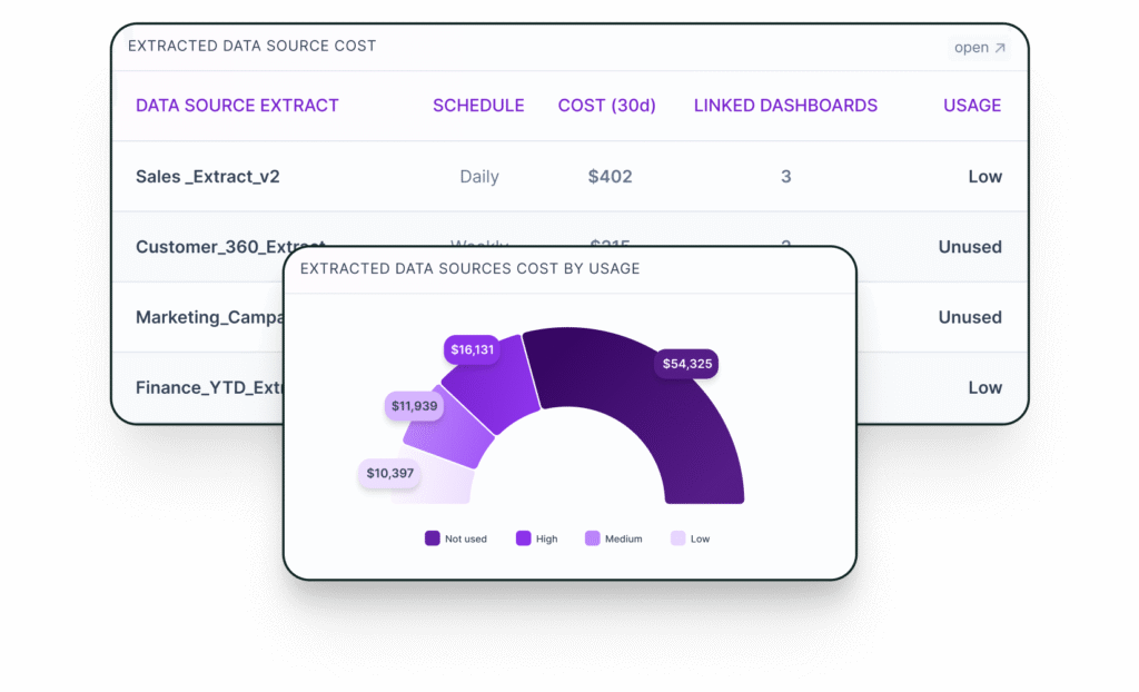 Over time, most of the organization’s dashboards become unused. Euno attributes dashboard usage to upstream dimensions, measures and refresh jobs, so you can see which assets deliver value, and which are just burning resources without being used.
