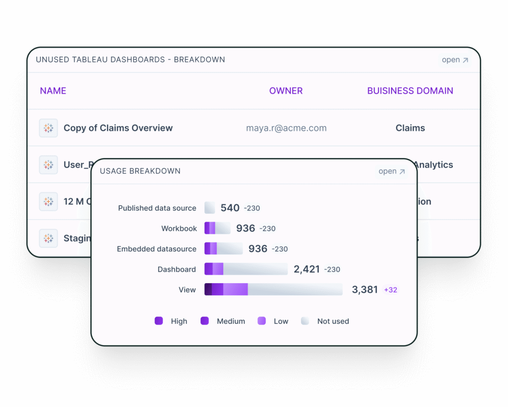 Euno flags assets with no recent activity, from warehouse tables that are never queried to BI dashboards with zero impressions, so you can keep your environment lean and easy to navigate.