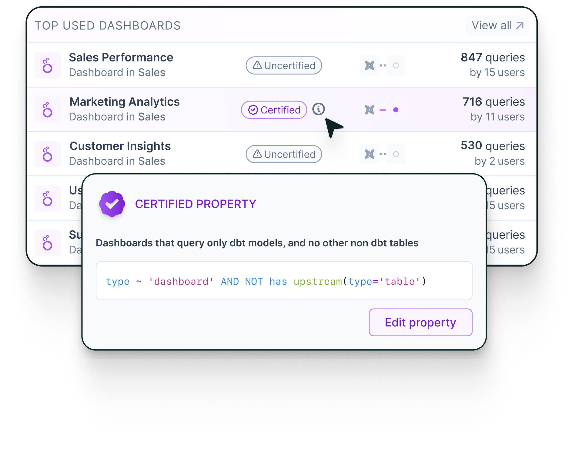 Continuously monitor Looker products’ dependencies on dbt models, governed metrics and compliant datasets to certify reports and dashboards for BI and AI use.